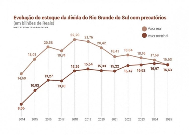 Bolívar CavalarRepórterDesde 2015 que o passivo do Rio Grande do Sul com precatórios é superior, em valores reais – ou seja, corrigidos pela inflação acumulada no período -, a R$ 16 bilhões. Apesar disso, em 2025 o governo gaúcho conseguiu reduzir o estoque nominal pela primeira vez em quatro anos, que atualmente totaliza R$ 16,633 bilhões.